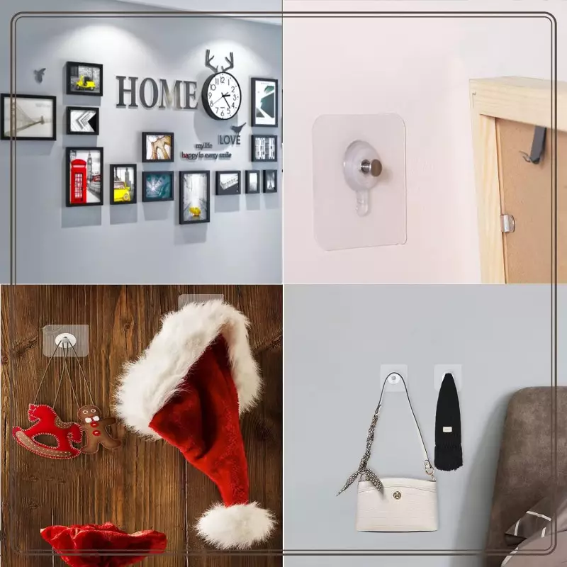 Klebende Wandhaken für zu Hause – kein Bohren erforderlich, um Rahmen, Bilder, Uhren, Kleidung oder Schmuck aufzuhängen. Praktisch für den Hausgebrauch, auch in feuchten Umgebungen geeignet. Sie können Bürsten, Badetücher, Tücher usw. tragen. Die Klebehaken sind wasserdicht und rostfrei. Wenn Sie Ihre Wände nicht beschädigen möchten, trocknen Sie sie und befestigen Sie sie für eine längere Nutzung.