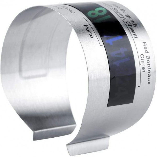 Flüssigkristallthermometer, gewidmet den wahren Weinkennern, die den Wein bei der richtigen Temperatur genießen möchten, um Aromen und Düfte optimal zur Geltung zu bringen. Der Durchmesser des Thermometers ermöglicht es, es an jede Art von Flasche anzupassen und leicht zu positionieren.