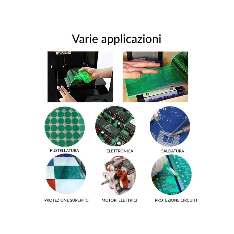 • Ideal für allgemeine Maskieren wie in Karosserieanwendungen, Lackieren und Beschichten von Pulver und Flüssigkeit, für die elektrostatische Flüssigkeitskapselung. Plating, Eloxieren, flammizzazione.