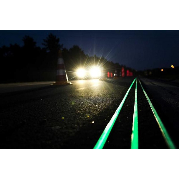 Die Farbe hat eine Harzbasis und erzeugt eine dicke photolumineszente Schicht, die nachts die klassische fluoreszierende Farbe zeigt.