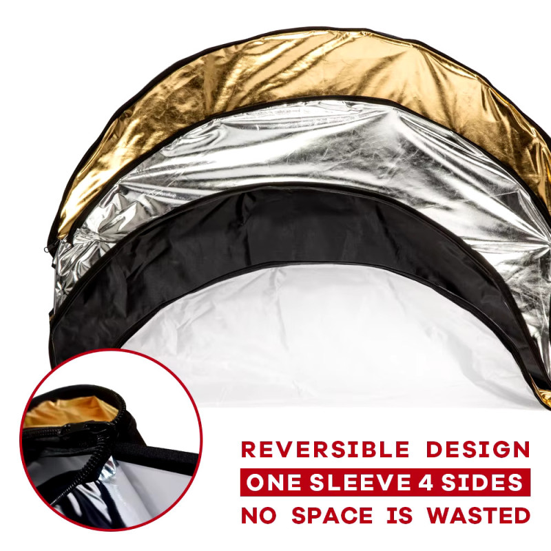 - Dieses 5-in-1-RF-60-Reflektor-Set (Durchmesser 60 cm) enthält ein transluzentes Panel zur Lichtdiffusion und einen wendbaren Überzug, der vier Farbeffekte bietet: Gold für warme Aufhellungen, Silber für kühle und klare Aufhellungen, Weiß für neutrale und weiche Aufhellungen und Schwarz zum Eliminieren übermäßiger Reflexionen.