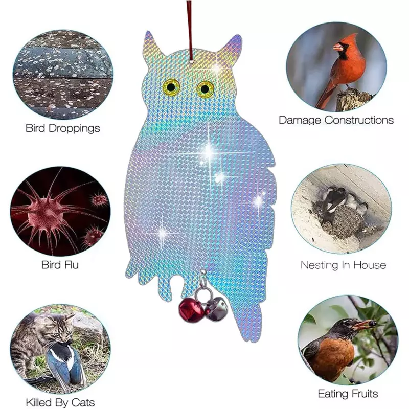 - Reflective Owl Scarecrow made of highly durable, weather-resistant PVC material for long-lasting use. Non-toxic and harmless, they scare birds away without harming them. The strong reflective properties of the hanging owls will last for many years, even when exposed to sun or rain.