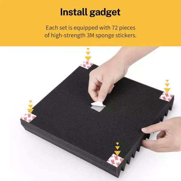 When sticking the acoustic foam, you need to stick the stickers on the foam by pressing before sticking the foam to the wall. It is recommended to stick 5 double-sided stickers on each piece of sound absorbing cotton.