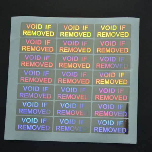 Efecto espejo impreso con la inscripción."VOID SI SE ELIMINA". (material holográfico, moviendo la etiqueta cambia el color)
