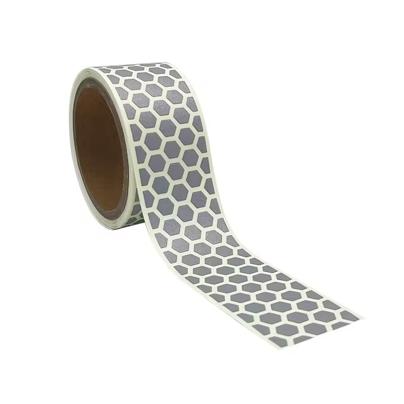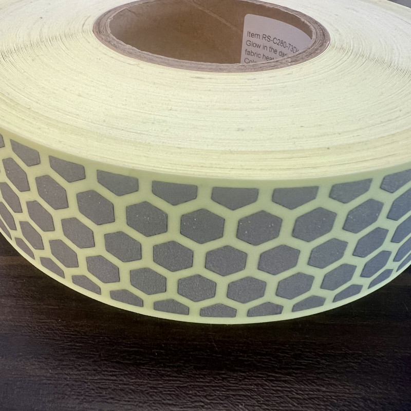Ancho 50 mm, con hexágonos reflectantes que se iluminan al recibir luz y el resto de la cinta luminescente que brilla de noche.