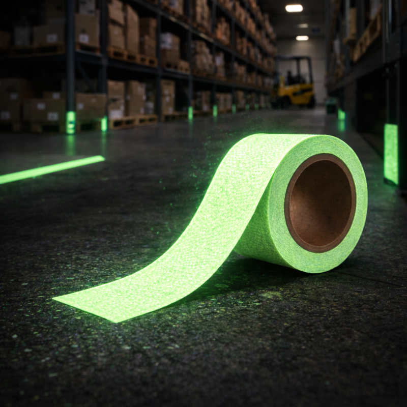 Cinta adhesiva luminiscente de óptima calidad que se presenta con un color blanco por el día y se convierte un color verde fluorescente por la noche, se recarga con cualquier fuente de luz (rayos solares o luz artificial). La cinta almacena la luz por el día y la desprende por la noche dejándola por un tiempo muy prolongado; el material mantiene su luminiscencia para siempre.