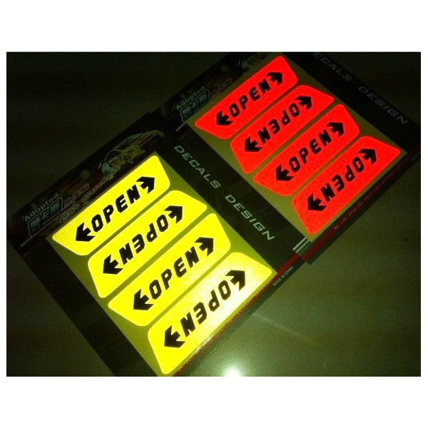 Hecho de vinilo adhesivo de color amarillo o rojo, con escrita "OPEN".