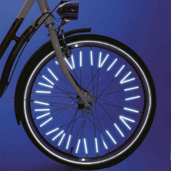 - Conjunto de revestimientos reflectantes para radios de la ruedas de bicicleta de la marca 3M™, que iluminados reflejan la luz en la dirección de donde ella viene.