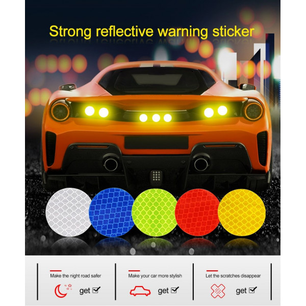 10 discosreflexivocon un diámetro de 3,7 cm que reflejanla luz en la dirección de donde proviene, haciendo que el objeto sobre el que se ha colocado el reflector sea más visible en la oscuridad. Alta visibilidad con una duración garantizada de varios años, aplicar sobre una superficie limpia y seca. Se pueden fijar a cualquier superficie dura, como bicicletas y más.Resistente al agua y a los rayos ultravioleta., disponible en más colores. Fabricado con material reflectante de diamante para una súper refracción.
