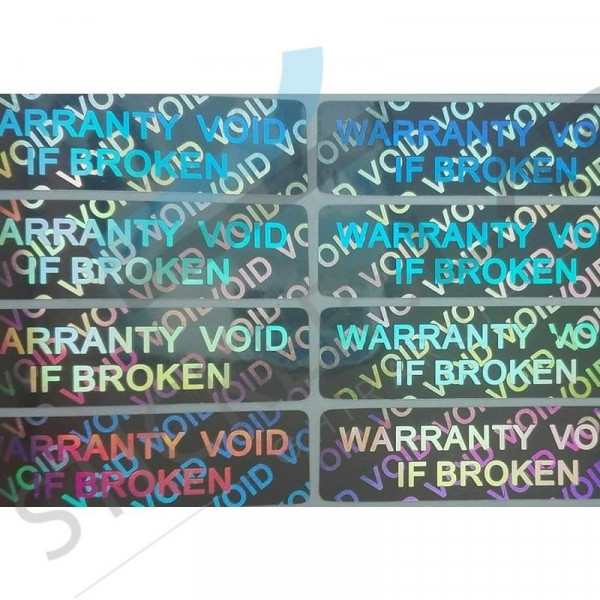 112 autocollants hologrammes de sécurité mesurant 4x1 cm, couleur argent avec réfringence orographique.