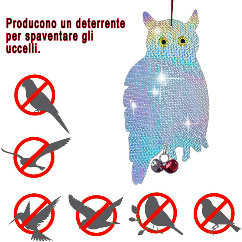 - Grâce au matériau dont elles sont faites (PVC réfléchissant) et au design en forme de diamant qui reflète la lumière sous plusieurs angles, les oiseaux resteront éloignés de votre maison ou jardin. Vous aurez un objet lumineux qui reflète le soleil et fait du bruit, surtout en cas de vent ; de plus, les petites cloches intensifient le signal sonore et éloignent les oiseaux nuisibles.