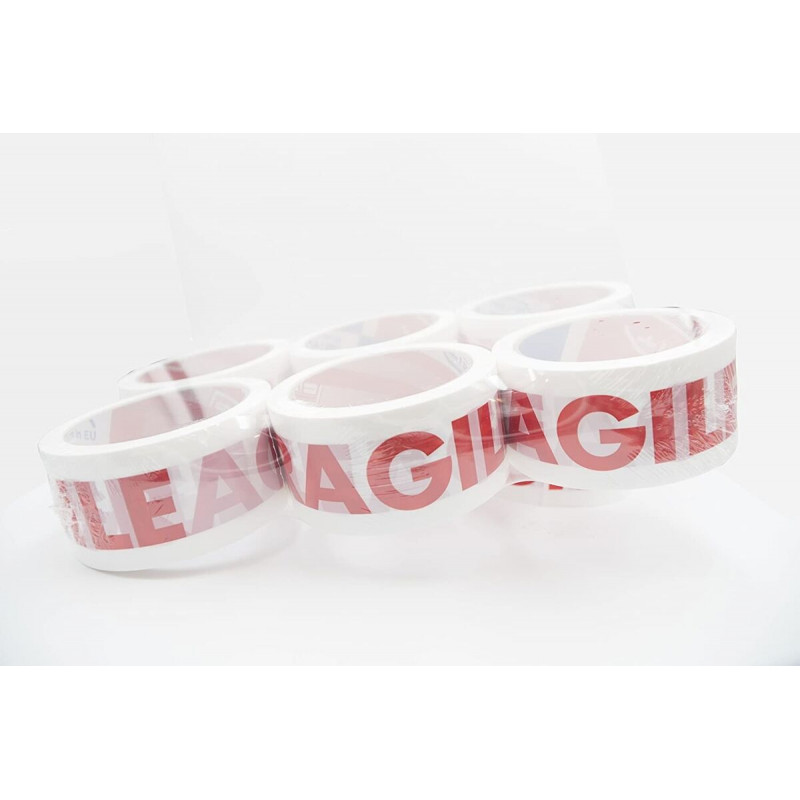 Ruban adhésif en polypropylène, 30 microns d'épaisseur, imprimé FRAGILE, sur fond blanc.