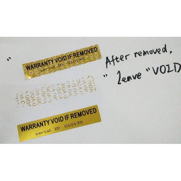 Etichette antieffrazione con le scritte "Warranty Void if removed" dotate di sigillo di garanzia.