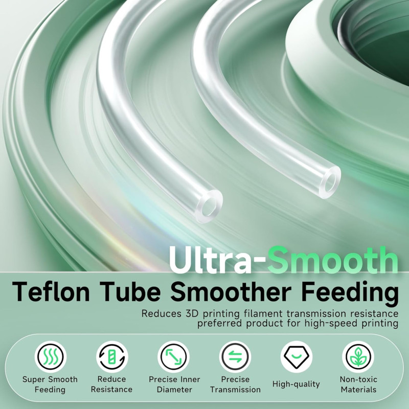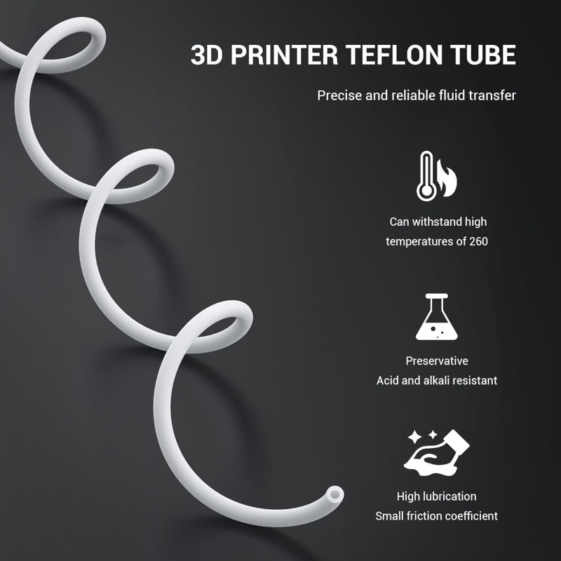 Realizzato in PTFE (Teflon®) di qualità industriale, questo tubo è progettato per ottimizzare l’alimentazione del filamento nelle stampanti 3D con sistema Bowden o come guida filo nelle macchine a estrusore diretto. La parete interna altamente liscia riduce l’attrito, limita gli attriti in curva e aiuta a prevenire impuntamenti, grinding e sotto-estrusione, soprattutto con materiali delicati (es. TPU, PLA).