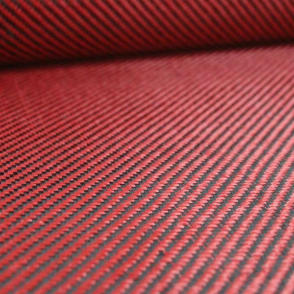 - Modello TWILL ovvero con tessuto intrecciato a onda, modello ibrido intrecciato con fibra di carbonio e fibra aramidica rossa..