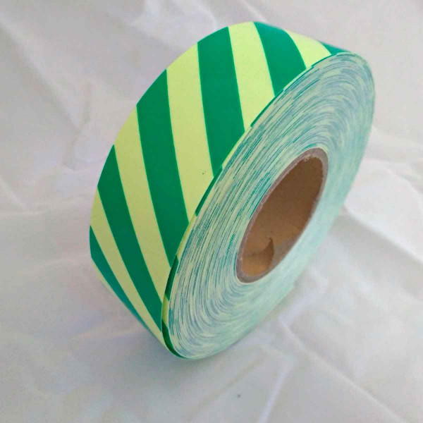 Nastro adesivo luminescente con stripe in PVC di colore verde, il nastro ha una larghezza di 50mm (5cm).
