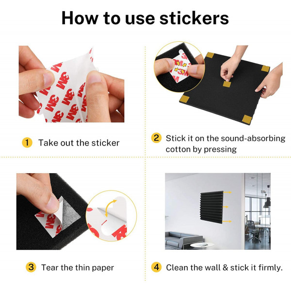 - Quando si attacca la schiuma acustica, è necessario attaccare gli adesivi sulla schiuma premendo prima di attaccare la schiuma al muro. Si consiglia di attaccare 5 adesivi a doppia parte su ogni pezzo di cotone fonoassorbente.