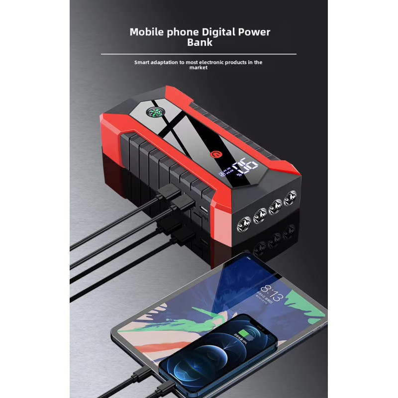 - O arrancador de bateria de alta capacidade possui 2 saídas USB (9V/2A e 5V/2A), além de uma porta 5V. Pode carregar rapidamente celulares e outros dispositivos. Lanternas de LED integradas com 3 modos Flash/Strobe/SOS oferecem máxima conveniência e flexibilidade. Além disso, graças a uma porta de 12V/10A, o jump starter também pode alimentar equipamentos DC 12V, como compressores de pneus e aspiradores de carro.