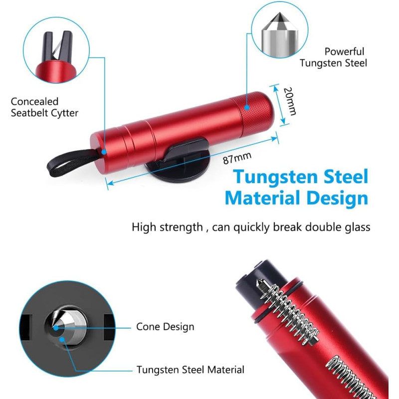- Ação dupla de salvamento: parta os vidros com a ponta em aço temperado e corte os cintos de segurança presos com a lâmina afiada. Duas ferramentas em uma para segurança total. Design ergonómico e antiderrapante: a pega segura e confortável permite agir rapidamente e com precisão, mesmo sob pressão.