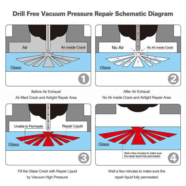 O kit é patenteado para remover o ar dentro da fenda do vidro e preenchê-lo com um copo líquido que bloqueia os fragmentos de vidro, para impedir que ele se espalhe./ P>