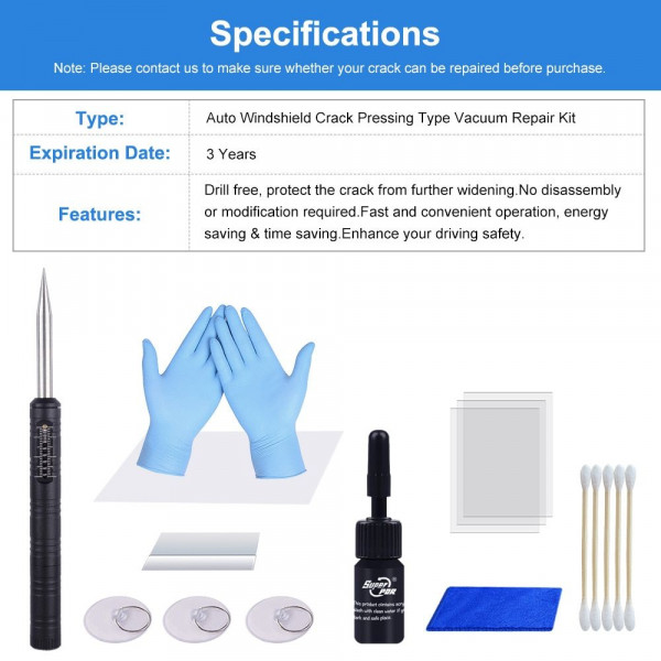 - Kit parareparar qualquer pequena rachadurano vidro do carro no para-brisa ou em qualquer vidro.