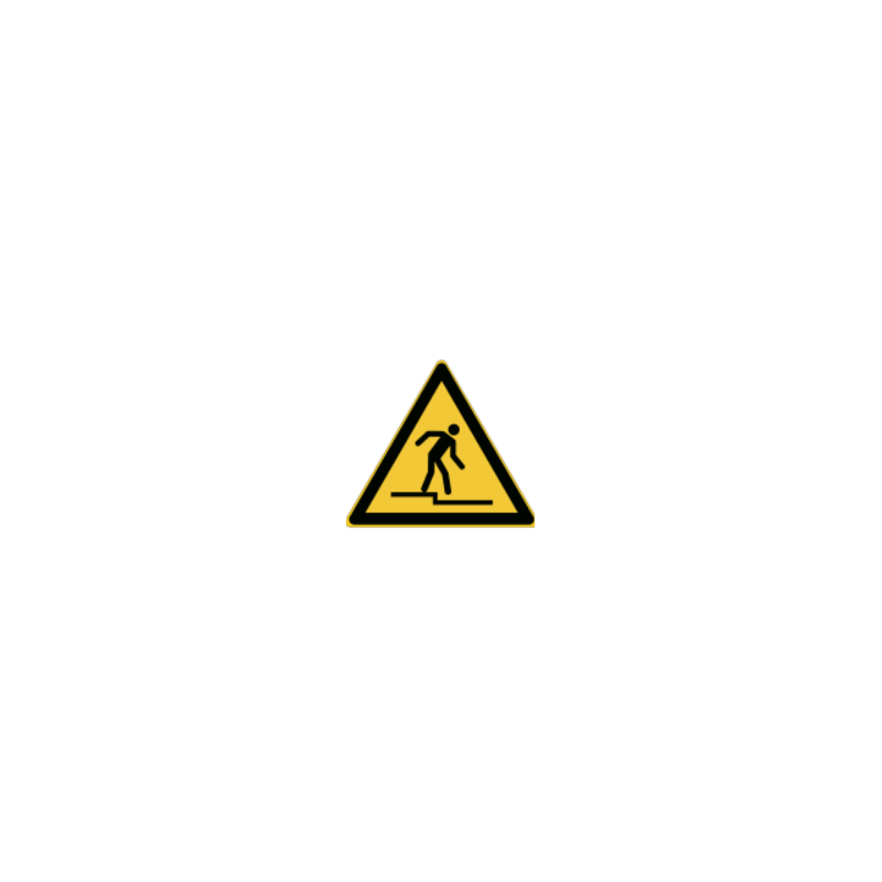 Placa triangular amarela com borda preta representando uma pessoa tropeçando em um degrau. Indica o risco de tropeçar ou cair devido a um degrau ou mudança repentina de nível.p>