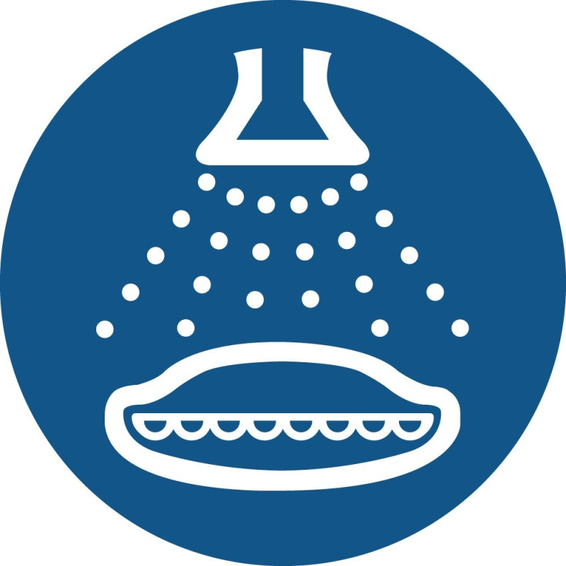 Placa de segurança que indica a obrigatoriedade de acionamento do sistema de pulverização da balsa salva-vidas. O pictograma branco sobre fundo azul proporciona uma indicação clara e imediata, essencial no ambiente marítimo para garantir o acionamento correto dos procedimentos de emergência e aumentar a segurança dos ocupantes durante as operações de evacuação.