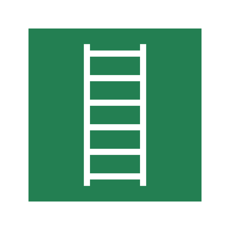 Esta placa indica a localização de uma escada fixa para uso em caso de emergência, como evacuação de edifícios ou estruturas. A escada pode levar a uma saída de emergência, a um andar inferior/superior ou a um ponto de encontro seguro. É essencial para garantir uma rota alternativa rápida quando as rotas comuns estiverem intransitáveis.