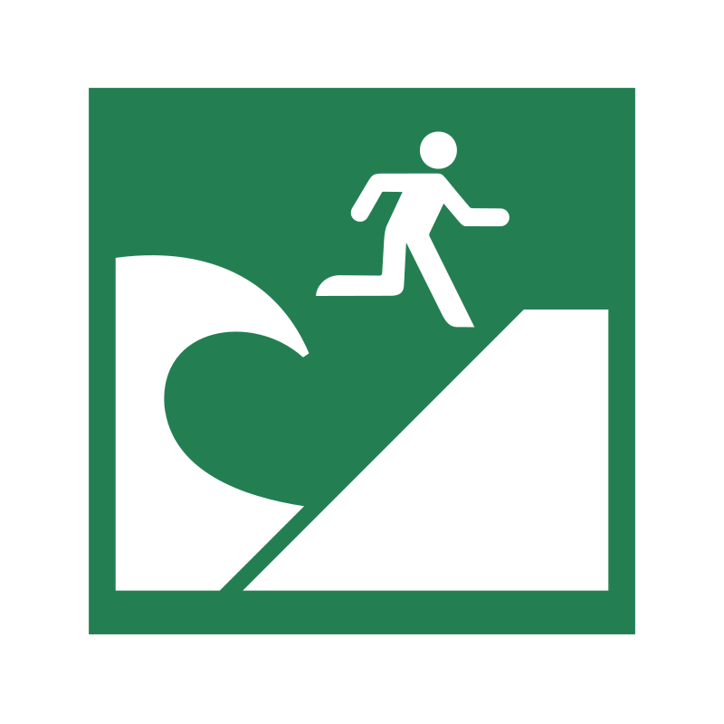 Este pictograma ISO 7010 indica a rota segura a seguir em caso de tsunami. Ele mostra uma pessoa correndo em direção a um local mais alto, representando a necessidade de se afastar rapidamente da costa e se dirigir a um local mais alto. É usado principalmente em áreas costeiras propensas ao risco de tsunami para orientar as pessoas em direção a rotas de fuga seguras.>